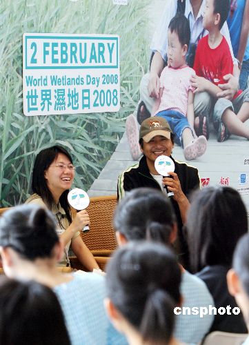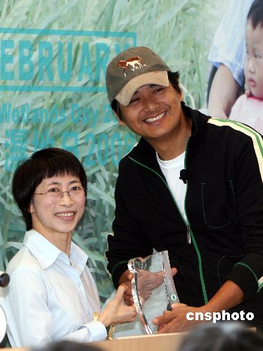 十月二十日,國際影視巨星周潤發在香港濕地公園舉行的世界濕地日2008香港區慶祝活動啟動儀式上,獲頒濕地保育大使委任狀。中新社發 武仲林 攝