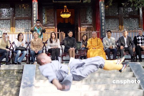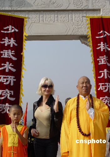 十月二十五日,俄羅斯美女體操明星霍爾金娜造訪嵩山少林寺。當(dāng)日,以俄羅斯國(guó)家杜馬體育、運(yùn)動(dòng)和青年事務(wù)委員會(huì)副主席、中俄友好、和平與發(fā)展委員會(huì)俄方青年工作分委會(huì)副主席亞歷山德拉·布拉塔耶娃為團(tuán)長(zhǎng)的俄羅斯奧運(yùn)冠軍代表團(tuán)一行訪問(wèn)嵩山少林寺。據(jù)悉,俄羅斯奧運(yùn)冠軍代表團(tuán)此次來(lái)訪是全國(guó)青聯(lián)為配合北京奧運(yùn)會(huì)舉辦的體育交流項(xiàng)目,也是二00七年中俄友好、和平與發(fā)展委員會(huì)中俄雙方青年工作分委會(huì)框架內(nèi)重點(diǎn)交流活動(dòng)之一。中新社發(fā) 李志全 攝