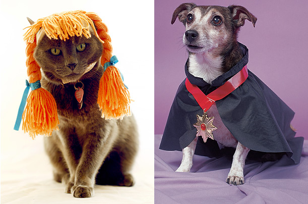 圖片二:左邊一副圖片中,一只可愛的小貓頭頂一副麻花辮假發,也許它想用它來嚇唬其他動物,可它沒想到這樣讓它看起來更可愛;在右邊一幅圖片中,一只小狗打扮成吸血鬼的模樣,威風凜凜的可愛模樣足以嚇走別人么?(鐘巖)