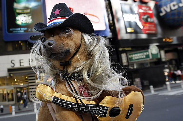 圖片四:沒聽說過“赤裸牛仔”么?那你可要落伍了!“赤裸牛仔”可是時代廣場最有名的人物之一。這不,連這個吉娃娃都是他的忠實粉絲,打扮成他最紅火時流浪歌手的模樣。(鐘巖)