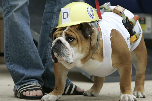 圖片十四:在美國衣阿華州得梅因年度最靚牛頭犬大賽上,波特豪斯頭戴鋼盔,身著工作服,打扮成一名建筑工人的模樣,閃亮登場(chǎng)。(鐘巖)
