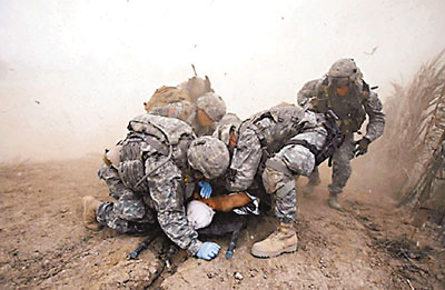 3月時一名駐伊美軍在戰斗中受傷,其他士兵保護他免受救援直升機激起的沙塵傷害。