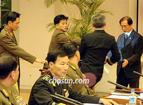 據報道,在此過程中,韓國會務人員海軍少校金某走向放置投影儀地方去要切斷電源,朝鮮一隨行人員推了兩次金某,表示強烈抗議。