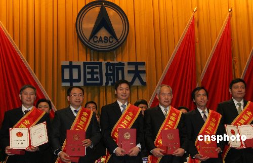 中華全國總工會決定頒發該集團一批為首次月球探測工程做出貢獻的集體和個人“全國五一勞動獎狀”、“全國五一勞動獎章”,中國運載火箭技術研究院“長征三號甲”系列運載火箭總指揮岑拯(左三)等獲得“全國五一勞動獎章”。