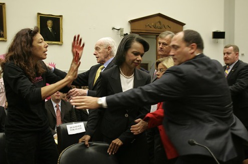 美國國務(wù)卿賴斯在國會作證時遭抗議。