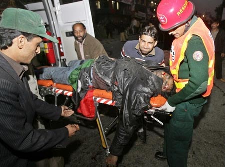 中新網12月27日電 據法新社報道,巴基斯坦前總理貝-布托今日在競選集會上遭到炸彈襲擊,不治身亡。圖為救援人員搶救傷者。(關新)