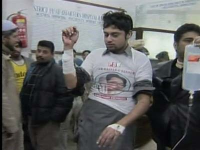 中新網12月28日電,據法新社報道,巴基斯坦前總理貝-布托27日在競選集會上遭到炸彈襲擊,不治身亡。圖為貝-布托的支持者被送往醫院。(關新)