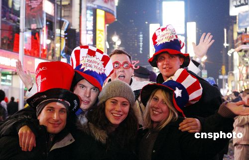 來自世界各地的游客在紐約時代廣場迎接新年到來。中新社發 鄧悅 攝