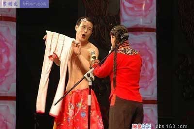 “臨時加塞兒”進來的小品名字叫《我要當明星》,節目編導就是趙本山。故作娘娘腔的“小沈陽”的表演異常火爆,包袱笑料一個接一個地抖出來,一會兒學劉德華,一會兒學阿杜。老趙臨時“空投”的這個小品從形式上看上去感覺有點像劇場里的熱場戲,但場上氣氛火爆。