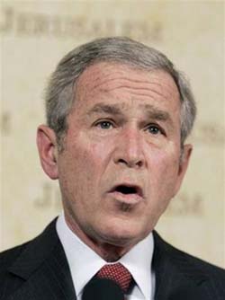 布什在與以色列總理奧爾默特會(huì)談結(jié)束后表示:“伊朗是全世界的威脅。我想重復(fù)以前說過的一句話:如世界各國不團(tuán)結(jié)一致阻止伊朗獲得研制核武器的技術(shù),那么它過去、現(xiàn)在和將來都是威脅。”