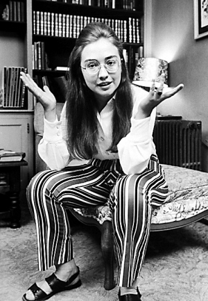 在上世紀60年代,希拉里仍是年輕大學生時,卻留了一頭禾稈草般的厚重長發,加上一雙土土的涼鞋,令她看上去像一位大嬸,而且她又穿了一條夸張的“豎條長褲”,感覺像滑稽小丑,爆笑效果一流。對于這張“經典倩影”,希拉里依然力撐到底:“這不是我的錯!60年代流行這一套!”
