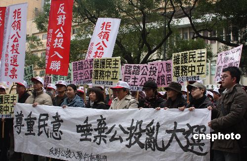 臺灣“中央選舉委員會”將從2月27日起主辦十場“入聯公投”、“返聯公投”意見發表會或辯論會,14日是反方代表申請期限。臺灣勞動黨主席吳榮元、民主行動聯盟總召集人黃光國到“中選會”遞交公投反方代表申請書,他們還率領“反公投入聯行動聯盟”成員在“中選會”前表達訴求,群眾高舉“反對公投入聯,拒領公投票”等標語,主張拒領公投票,要求中國國民黨與民主進步黨拋棄“公投入聯”、“公投返聯”議題。中新社發 耿軍 攝