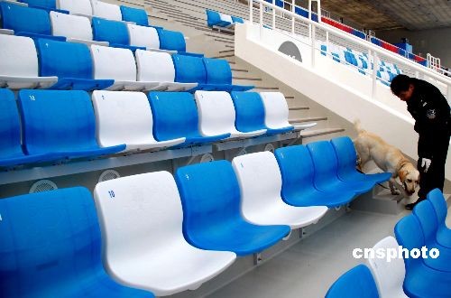 警察帶警犬檢查北京奧運場館“水立方”座椅設施。