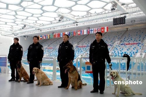 北京朝陽公安警犬隊民警準備對奧運場館“水立方”實施無遺漏防爆安全檢查。