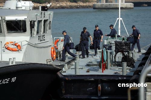 三月二十四日﹐參加香港海域嚴重撞船意外的海警隊員整裝待發。二十二日晚﹐香港國際機場以東的大小磨刀洲海面發生嚴重撞船意外,一艘烏克蘭注冊的油田補給船與一艘內地貨船相撞﹐補給船迅速翻沉﹐七名船員獲救﹐十八名烏克蘭船員隨船一并沉落在三十七米海底﹐至今下落不明。中新社發 武仲林 攝