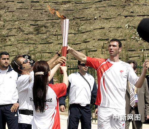 希臘當(dāng)?shù)貢r(shí)間3月24日,北京二00八年奧運(yùn)會圣火采集儀式在古奧林匹亞競技場舉行,隨后火炬希臘傳遞開始。第一棒希臘運(yùn)動員亞歷山大和第二棒中國的雅典奧運(yùn)會冠軍羅雪娟對接火炬。 中新社記者 王歡