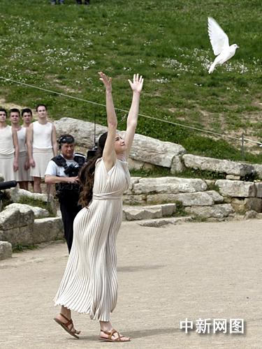 希臘當地時間3月24日,北京二00八年奧運會圣火采集儀式在古奧林匹亞競技場舉行,最高女祭司順利采集到火種。一名女祭司手捧白鴿走到眾人之前,面向古競技場放飛白鴿。 中新社記者 王歡