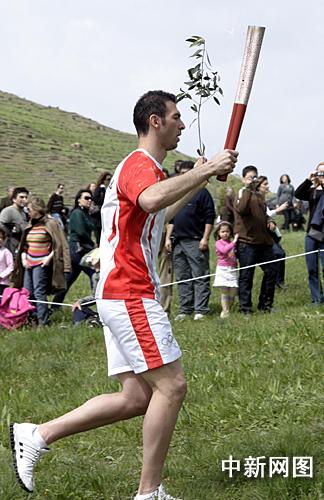 希臘當地時間3月24日,北京二00八年奧運會圣火采集儀式在古奧林匹亞競技場舉行,隨后火炬希臘傳遞開始。第一棒火炬手亞歷山大右手擎火炬,左手舉橄欖枝跑向顧拜旦墓。 中新社記者 王歡