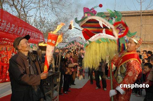 2008年3月24日,奧運圣火采集儀式在希臘隆重舉行的同時,山東省棗莊市市中區齊村鎮柏山村的農民們,在村里的千年老槐樹下以當地最傳統的方式模擬了圣火采集過程。中新社發 張大東 攝