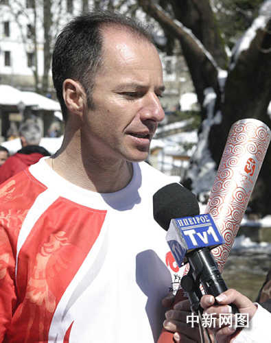 3月26日,北京奧運會圣火希臘境內傳遞第三日,抵達冰雪覆蓋的山城邁措翁。火炬手、希臘越野滑雪運動員尼克考斯期待自己能參加2010年溫哥華冬奧會。中新社記者 王歡