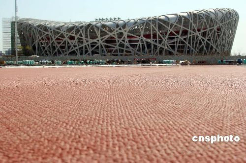 隨著北京奧運會腳步的逐漸臨近,奧運場館的建設也進入了最后的收尾階段。3月下旬,國家體育場“鳥巢”旁的熱身場地塑膠跑道已基本鋪設完成。中新社發 富田 攝