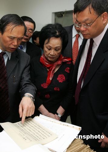 三月二十七日,宋子文長女馮宋瓊頤(中)在其親屬的陪同下參觀了上海圖書館,并在盛宣懷檔案整理工作室里見到了宋子文代理“行政院長”時所簽署的公文原件。據悉,這是馮宋瓊頤定居美國近六十年后首次返抵祖國大陸。中新社發 湯彥俊 攝