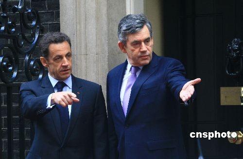 圖為布朗(右)和薩科奇會見后準備離開,前往出席英法高峰會。中新社發 李鵬 攝