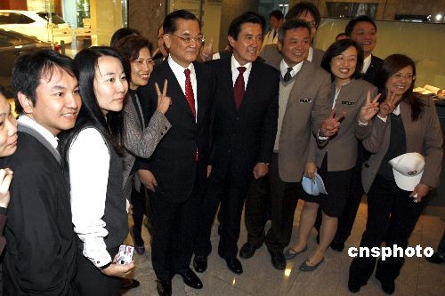 臺(tái)灣地區(qū)領(lǐng)導(dǎo)人當(dāng)選人馬英九上午拜會(huì)中國國民黨榮譽(yù)主席連戰(zhàn)。會(huì)后和工作人員與市民一起合影。中新社發(fā) 杜洋 攝