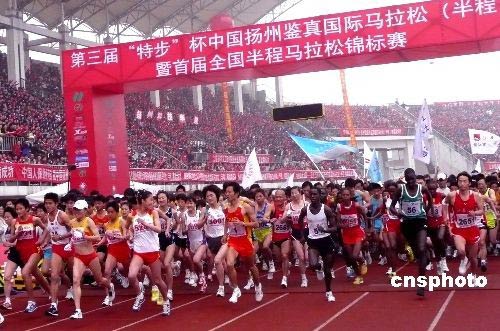 4月6日,第三屆鑒真國際馬拉松半程賽暨全國首屆半程馬拉松錦標賽在揚州拉開戰(zhàn)幕。來自二十多個國家和地區(qū)的一萬多名馬拉松運動員和長跑愛好者參與了此次盛會。這是中國唯一以人名命名的馬拉松賽事,以曾經(jīng)東渡日本的唐朝大和尚鑒真。經(jīng)過激烈的角逐,中國選手包攬了男女半程馬拉松的冠軍,本次馬拉松比賽男女前三名成績均破賽會紀錄。