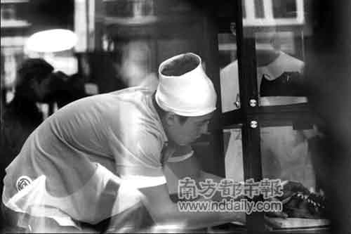2006年9月,在上海鞋店開張前,陳冠希在御用唱片監(jiān)制兼死黨陳奐仁陪同下,親自前往視察裝修情況,現(xiàn)場見陳冠希不斷向裝修工人指手畫腳,態(tài)度十分認真,隨后還親自擦櫥窗、擺放波鞋和收拾鞋柜(見上圖),可見對這間店非常著緊。