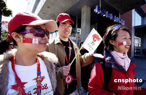 當地時間四月九日,北京奧運火炬在美國舊金山傳遞。兩名華人女青年為支持北京奧運,將自制的中國國旗和北京奧運標志貼在臉上參加傳遞活動。陳鋼 攝
