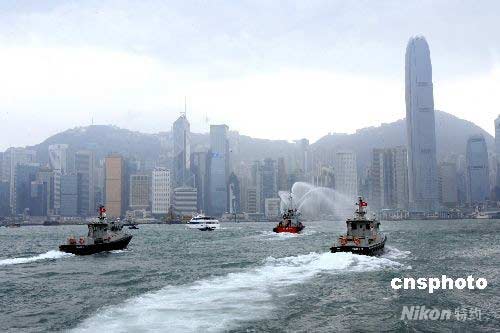 香港舉行北京奧運火炬傳遞路線預演,維港海上數艘警用巡邏艇、快艇、護送火炬傳遞游輪過海,消防船在維港射水致意、飛機空中盤旋護駕。 王麗南 攝