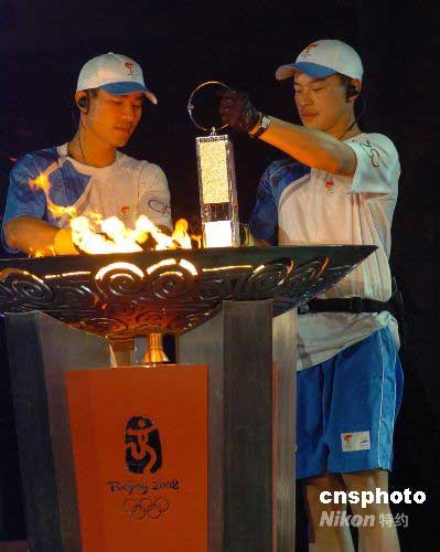 五月三日晚,兩名圣火護衛(wèi)隊員在澳門漁人碼頭收回圣火盆中的火種,2008北京奧運火炬接力在澳門圓滿結(jié)束。中新社發(fā) 史利 攝