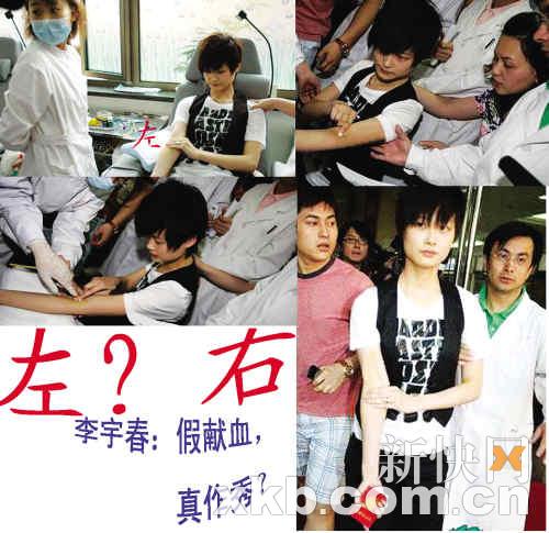 但是李宇春此次義舉卻被網(wǎng)友質(zhì)疑是一場做秀,有網(wǎng)友在論壇貼出圖片,“揭發(fā)”李宇春獻血的手忽左忽右。昨日記者致電天娛負(fù)責(zé)藝人管理的胡小姐,對方對做秀傳言表現(xiàn)得很氣憤,說:“現(xiàn)在這個時候,如果這種事都還造假,那就根本不配做藝人,甚至不配做人。”