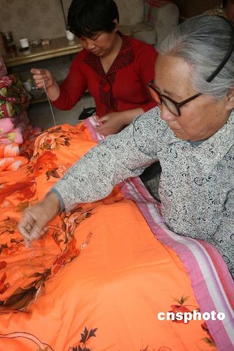 5月19日,在山東博興縣城東街道辦事處顧家村,幾名農家婦女正在趕制新被,她們打算將縫制好的被褥,通過當地有關慈善部門捐往地震災區。 四川省汶川縣5月12日發生8.0級地震后,災情時刻牽動著當地農民的心,他們通過看電視、聽廣播等各種方式高度關注抗震救災進展情況,他們踴躍向災區捐錢、捐物,當他們了解到災區缺乏被褥等生活用品時,自己出錢購買回了布料、棉花絨等,趕制被褥,希望能以最快的速度送往災區,幫助災區人民群眾早日度過難關,恢復正常生活。