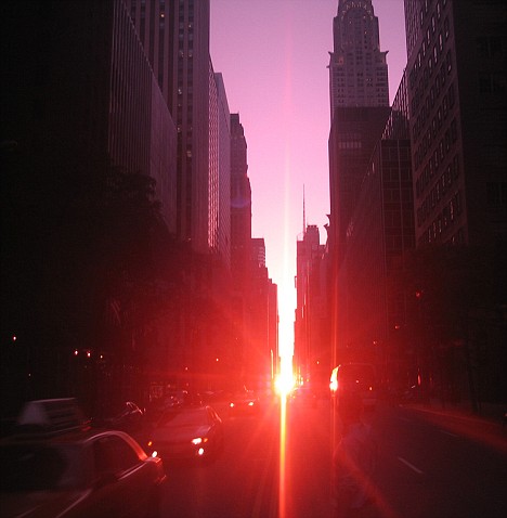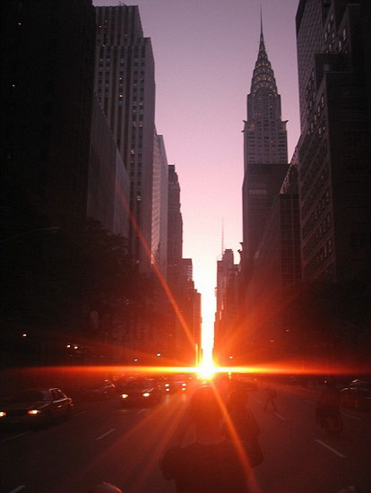 據悉,每年有兩天落日會對齊紐約曼哈頓主要的東西向街道,城市中高建筑會擋住落日,使曼哈頓看起來像是現代的巨石陣,整個紐約不夜城都沐浴在陽光下。