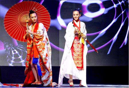 日本佳麗(左)與韓國(guó)佳麗各自穿出擁有該國(guó)特色及改良式民族服裝。
