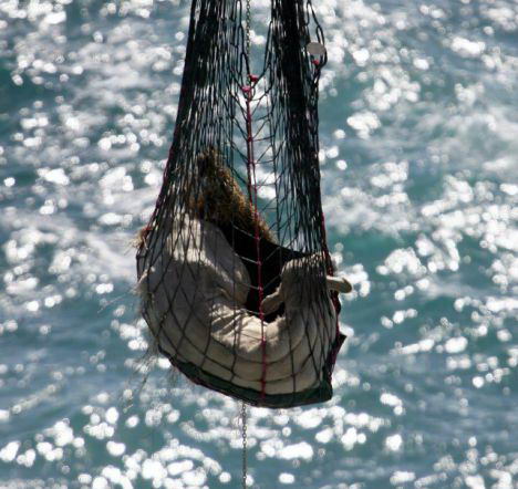 皇家海軍直升機將裝在網里的公牛運出懸崖,將它送回牛群。