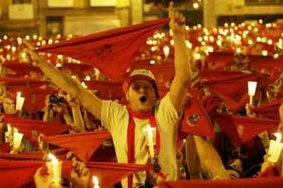 15日凌晨,成千上萬的狂歡者聚集到潘普洛納市政廳前,手舉蠟燭和紅絲巾參加奔牛節(jié)閉幕活動(dòng)。