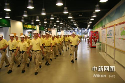 安保人員列隊進(jìn)入主新聞中心進(jìn)行排爆工作。攝影:宋方燦