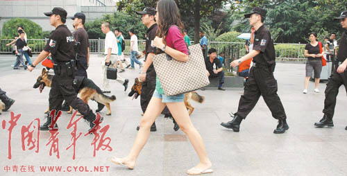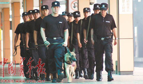 奧運會即將舉辦,突發事件隨時可能發生。為此,上海鐵路警方調集鐵警精銳進駐上海站,并成立了鐵路上海站奧運安保前線指揮部。7月以來,鐵路特警全副武裝攜警犬在上海站、車站廣場及與地方接合部晝夜進行巡邏檢查。