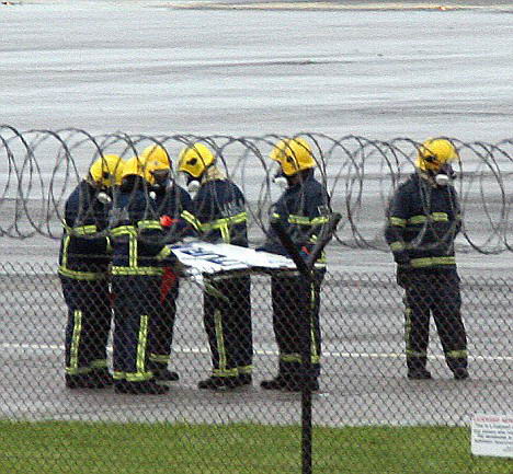 消防員發現一架飛機的受損翼尖