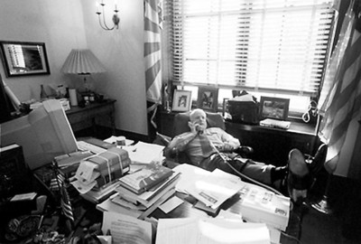 他的辦公桌面則活脫脫一間倉(cāng)庫(kù):一個(gè)貝利·高華德的搖頭公仔,一個(gè)泰迪·羅斯福的填充人偶,一個(gè)盛滿羽毛的杯子,一個(gè)帽子上寫著“軍隊(duì)”二字的綠色巫婆填充玩偶,一條刻著在伊拉克戰(zhàn)死的某士兵名字的手鐲,以及數(shù)不清的碎紙、石頭、硬幣和曲別針。粘在桌子一角的簽語(yǔ)餅的小紙條很容易勾起人們的回憶,上面寫著:“相比于金錢和成功,原則對(duì)你更重要。