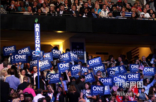 Jim Leach作為共和黨員也上臺為奧巴馬發(fā)表演講,臺下觀眾紛紛拿出“同一個國家”的標(biāo)語表示支持。馬婧 攝