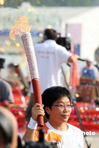 第一棒火炬手、北京市殘疾人體育訓練中心和職業技能培訓中心的肢體殘疾者汪涓傳遞火炬。 中新社發 張宇 攝