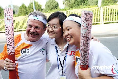 9月4日,殘奧會火炬到達北京,將在北京的“一壇兩園”展開最后一天傳遞行程。據北京市體育局副局長孫學才介紹,北京地區的240名火炬手既有工作在基層一線的普通勞動者,又有體壇名將、文藝工作者。其中,殘疾人士共70名,占火炬手總數的近30%。中新社發 王昊 攝