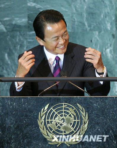 9月25日,在美國紐約聯合國總部,參加聯大一般性辯論的日本首相麻生太郎用日語講了幾分鐘后得知大會的日語翻譯未就位,臺下代表聽不懂他說什么時不禁有些尷尬地啞然失笑。當日,第63屆聯大一般性辯論進入第三天。新華社記者 侯俊 攝