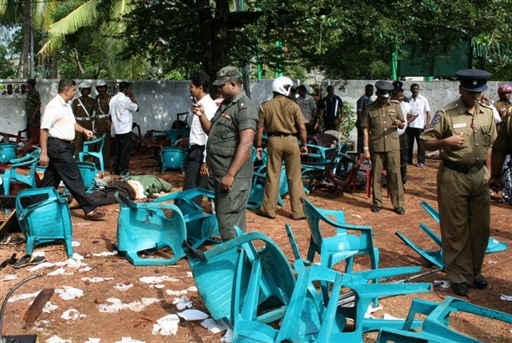10月6日,在斯里蘭卡北部阿努拉德普勒鎮(zhèn),安全人員查看爆炸現(xiàn)場(chǎng)。當(dāng)天上午,一名自殺式襲擊者在阿努拉德普勒鎮(zhèn)老汽車(chē)站附近引爆了身上的炸彈。包括斯前陸軍參謀長(zhǎng)佩雷拉及其夫人在內(nèi)的至少27人在爆炸中死亡。