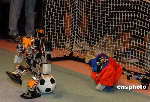 圖為參展的機(jī)器人在進(jìn)行射門和防守對抗。中新社發(fā) 朱沿華 攝