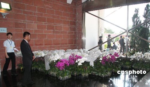 臺塑企業創辦人王永慶的遺體十七日由長榮班機運抵臺灣,靈堂設在桃園縣的長庚大學活動中心。圖為大批潔白的蝴蝶蘭鮮花運抵靈堂。從十八日上午開始,靈堂開放各界吊唁。中新社發 耿軍 攝